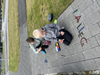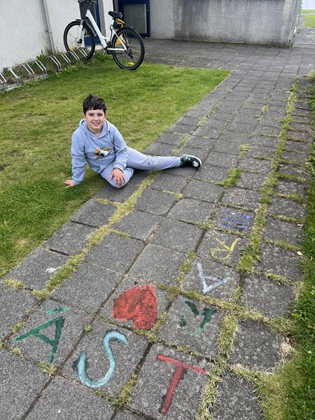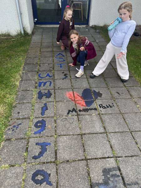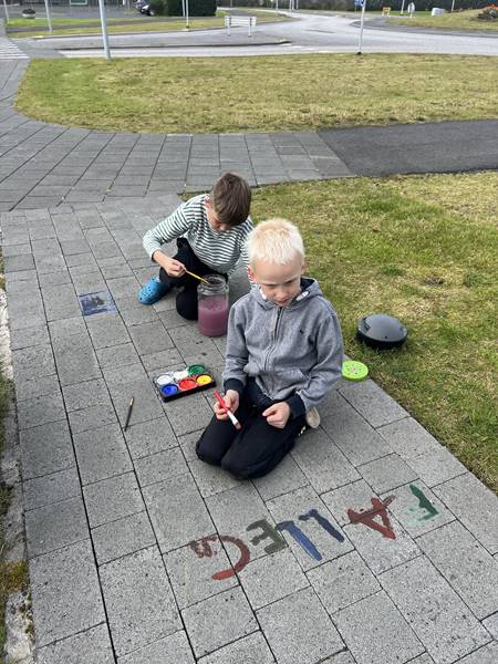 Myndmenntakennarinn sótti innblástur á vefsíðu Göngum í skólann og fór með nemendur sína í skapandi gönguferð um nánasta umhverfi. Með sér höfðu þau vatnsliti og krítar, og fóru nemendur að mála og skreyta stéttar og gangstéttar með jákvæðum skilaboðum og litríku myndefni. Verkefnið vakti mikla gleði og virkjaði hugmyndaflug nemenda, einn nemandi í 6. bekk vildi endilega mála regnbogafánann á stéttina „af því að við erum öll velkomin“, eins og hann orðaði það sjálfur. Annar nemandi ritaði stórum stöfum á bílaplan leikskólans hlýleg skilaboð sem hugsuð voru sem orðsending frá leikskólabörnum til foreldra sinna.